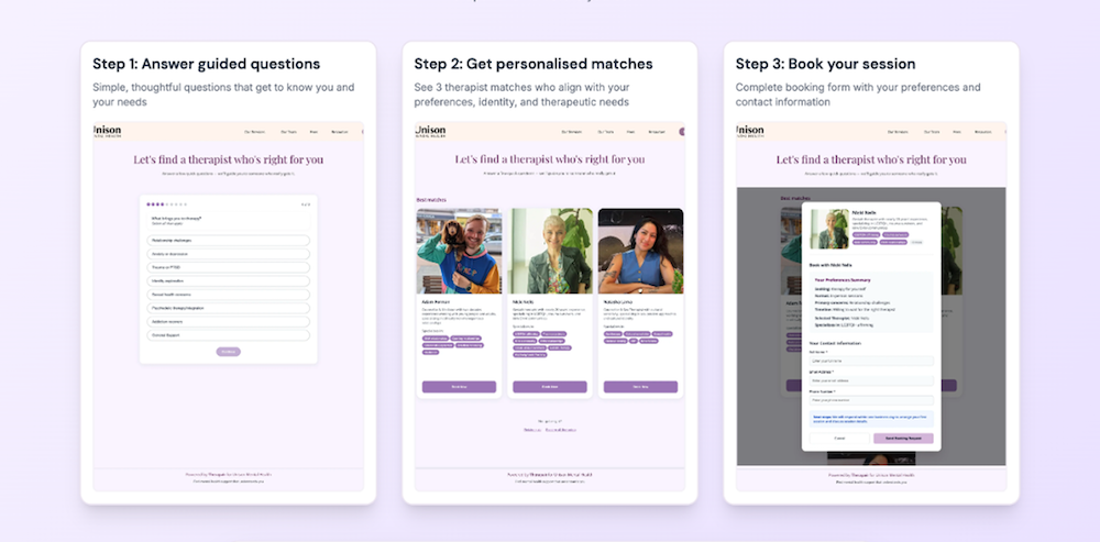 Therapair connects LGBTQI+, neurodivergent, and trauma-informed therapy seekers with practitioners who truly understand them. Prequel partnered with Unison Mental Health to design and ship an MVP: a conversational, privacy-first experience live as both a standalone product and a Unison-branded widget showing only Unison therapists.